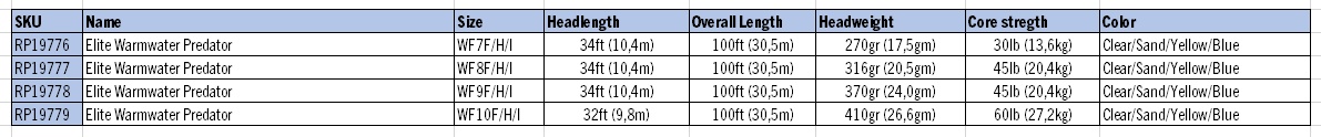 RIO Elite Warmwater Predator WF Flyt/Hover/Intermediate on suunniteltu helpottamaan suurten perhojen heittämistä lämpimissä ilmastoissa. Tämä siima perustuu RIOn suosittuun Elite Predator -sarjaan ja sisältää lyhyen ja voimakkaan etukartion, joka helposti kääntää raskaat perhot kuten popperit ja streamerit. Siiman jäykkä DirectCore-ydin parantaa hallintaa ja varmistaa tehokkaat strip-setit. Kolmivärinen siima lisää näkyvyyttä vedessä, ja SlickCast-pinnoite parantaa kestävyyttä ja heittopituutta, tehden siitä ihanteellisen valinnan lämpimän veden petokalastukseen.