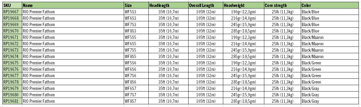 Rio Premier Fathom Sink 6 on suunniteltu erityisesti järvillä tapahtuvaan perhokalastukseen. Sen keskipitkä heittopää ja lyhyt etukartio lataavat vavan nopeasti ja mahdollistavat pitkät heitot. Upposiima vajoaa 6 tuuman sekuntivauhdilla ja saavuttaa nopeasti oikean syvyyden. Siimassa on Hang Marker -merkki 6 metrin päässä siiman kärjestä, mikä auttaa parantamaan tärppimahdollisuuksia hidastamalla siiman liikettä oikeaan aikaan. Kaksivärinen rakenne helpottaa heittopään ja juoksusiiman tunnistamista, ja SlickCast-pinnoite varmistaa kestävyyden ja sulavat heitot.