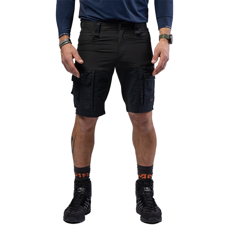 Nelisuuntainen jousto vyötäröllä, kestävät vetoketjut ja jämäkät, tuplavahvistetut vyölenkit tekevät shortseista hyvän valinnan sekä työhön että vapaa-aikaan. Moni-öglainen kiinnitysjärjestelmä mahdollistaa raskaampien työkalujen, kuten kirveen tai karabiinien, turvallisen kuljettamisen.