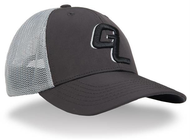 Guideline GL Logo Cap on trucker-lippis, jossa on tummanharmaa ripstop-materiaali edessä ja vaaleammat harmaat Spandex-verkkopaneelit takana, jotka tarjoavat joustavuutta, ilmanvaihtoa ja mukavan istuvuuden.
