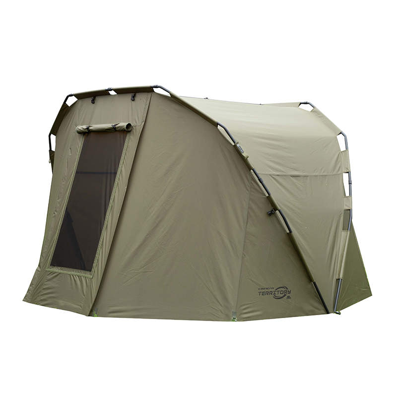 Tukeva kahden miehen karppibivvy, jossa on 210D-kangas ja 19 mm:n runko, täydellinen kahdelle vuoteelle ja varusteille, ja jossa on takaosan ilmanvaihto ja tarrakiinnitteinen maaverkko.