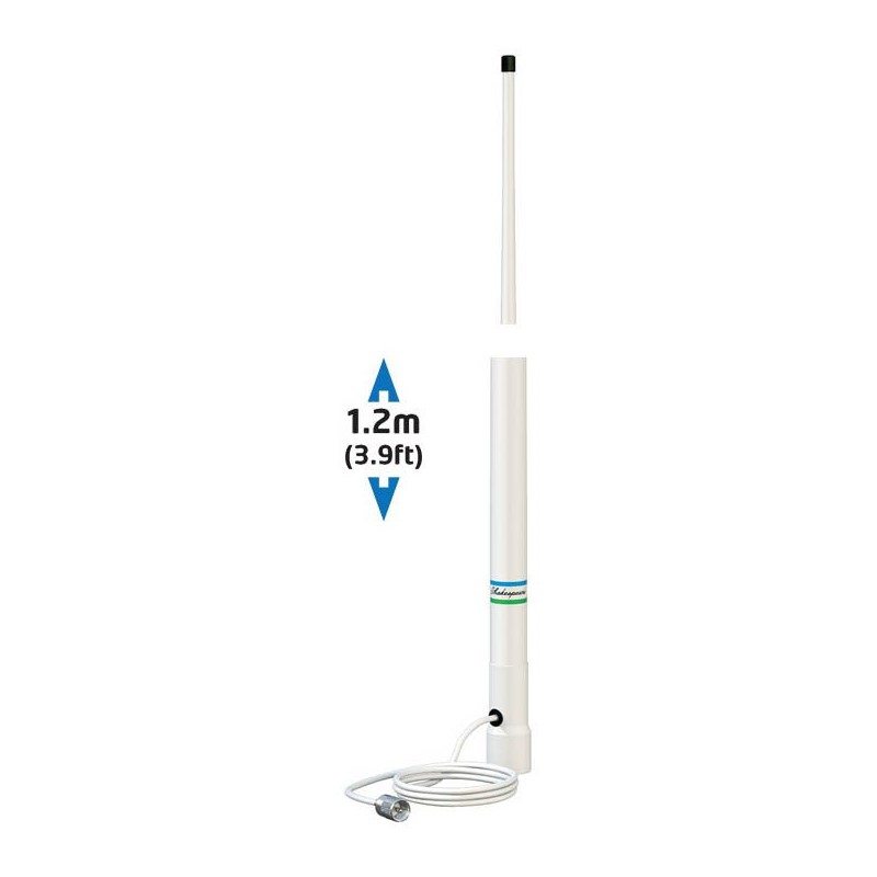Klassinen 426-N Atennatanko valkoista korkealaatuista lasikuitua Sopii moottoriveneisiin, RIB-veneisiin ja työveneisiin Perusrakenteinen polykarbonaattijalusta 1-14 kierteellä Leveä kantama lisävarusteena saatavien kiinnikkeiden avulla Vahvistus 3db 1,20m 4,5m RG58-kaapeli PL 259-liitin